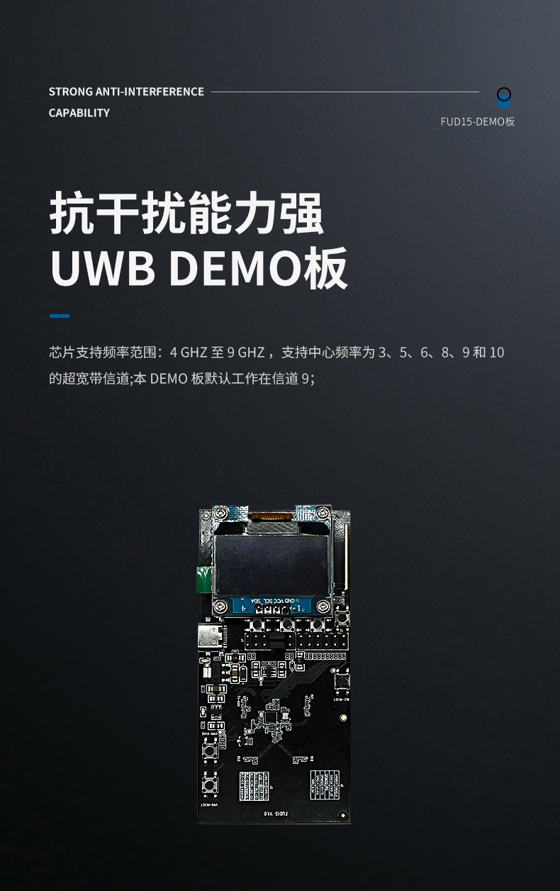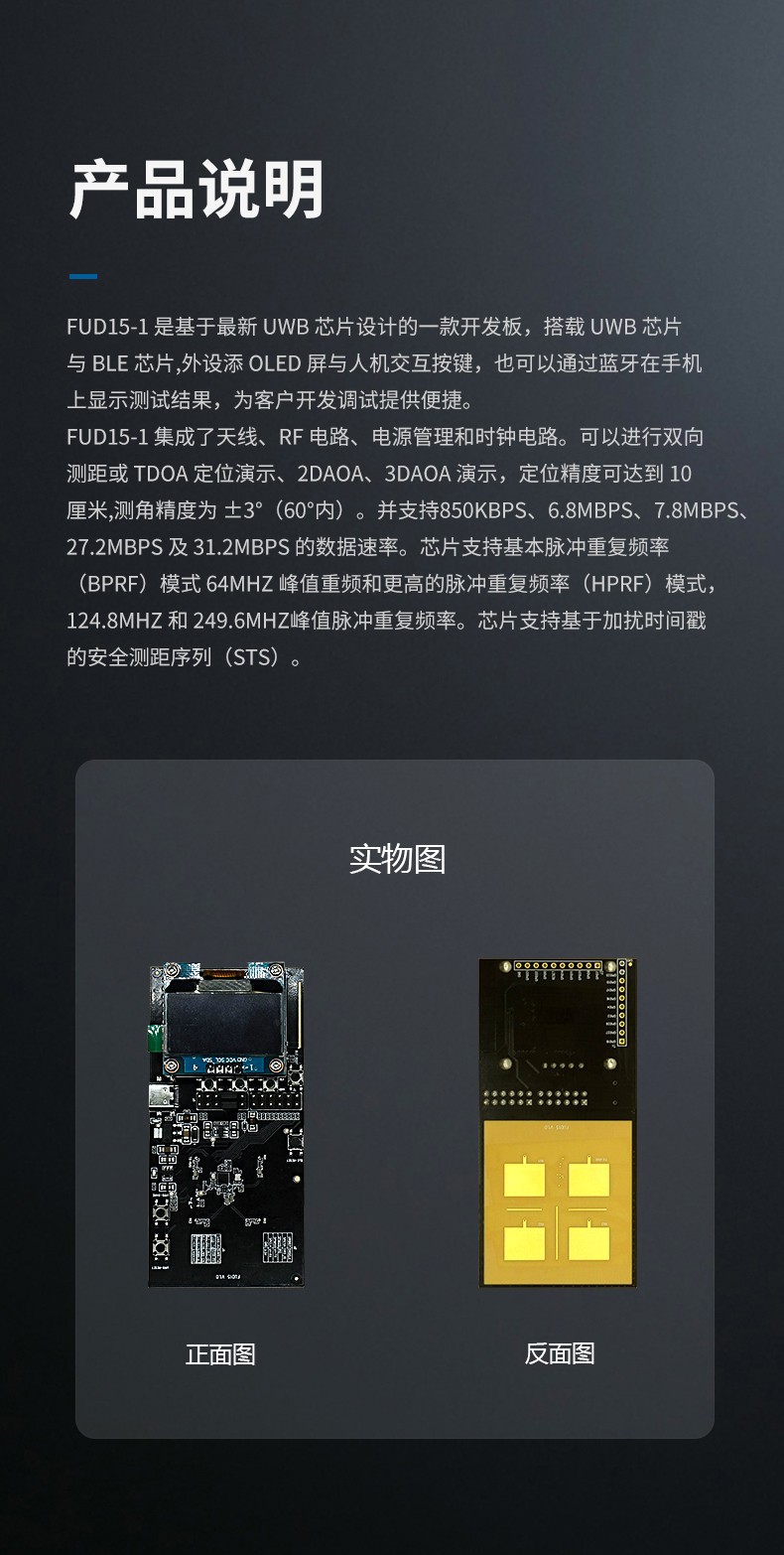 FUD15-1 是基于 UWB 芯片設(shè)計的一款開發(fā)板,搭載 UWB 芯片與 BLE 芯片,外設(shè)添 OLED 屏與人機交互按鍵,也可以通過藍牙在手機上顯示測試結(jié)果,為客戶開發(fā)調(diào)試提供便捷。 FUD15-1 集成了天線、RF 電路、電源管理和時鐘電路。可以進行雙向測距或 TDOA 定位演示、2DAOA、3DAOA 演示,定位精度可達到 10 厘米,測角精度為 ±3°。