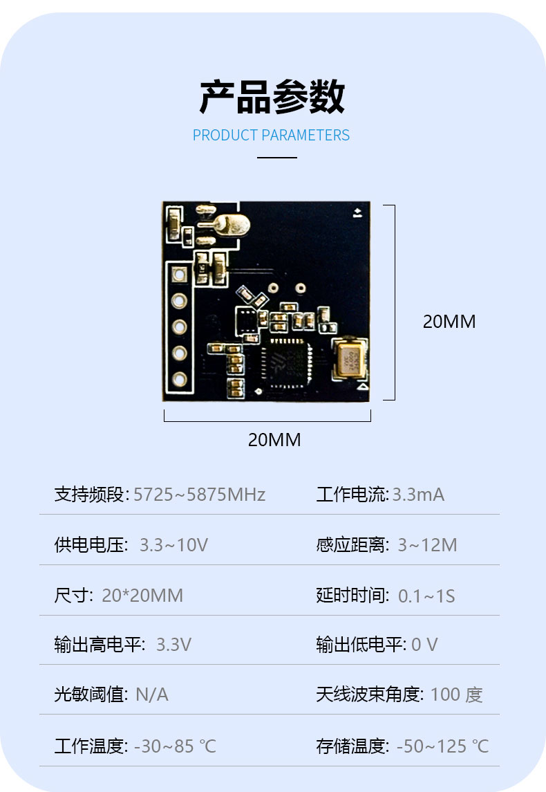 FR58L4LS-2020M-2 簡稱 2020M 是飛睿智能推出的高性能低功耗 5.8G 雷達傳感器,雷達模塊利用多普勒原理,通過天線發(fā)射高頻電磁波并接收初期反射波,以此判斷覆蓋范圍內(nèi)物體的移動,給出相應電信號。模塊尺寸 20*20MM,該模塊集成了 5.8G 微波電路、中頻放大電路以及信號處理器,集成度高且生產(chǎn)一致性好,模塊內(nèi)置32 位 MCU 和收發(fā)天線,大大提高了傳感器的感應性能。雷達模塊感應距離遠、角度廣、無死區(qū)、透鏡和透鏡老化問題不受溫度、濕度、氣流、灰塵、噪聲、亮暗等影響。模塊內(nèi)植入濾雨樹葉算法,能過濾掉雨水樹葉的誤觸發(fā),性能穩(wěn)定,廣泛應用于智慧照明、智慧安防等多個領域。